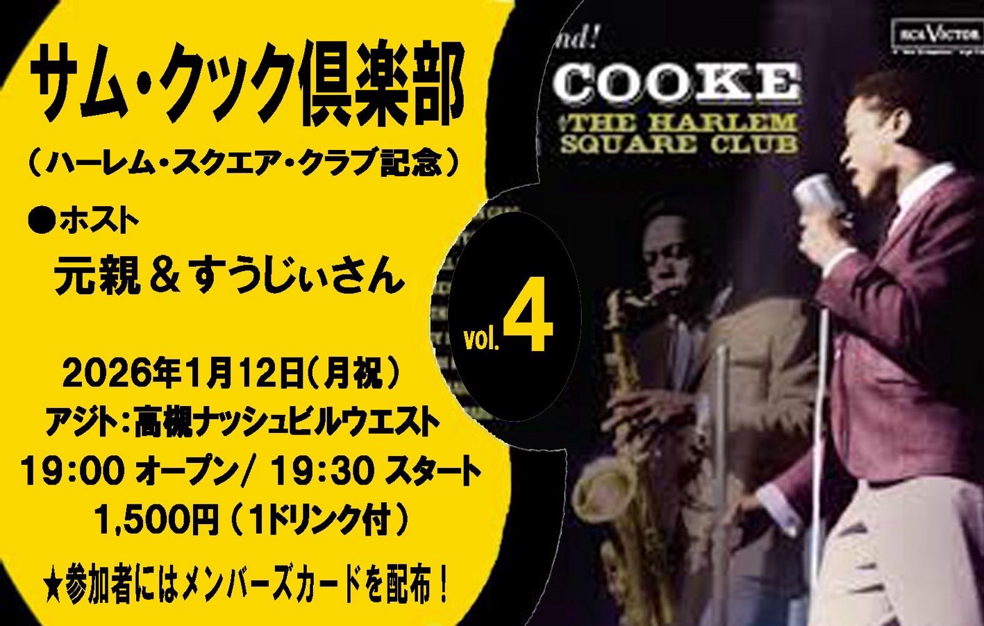 | 2026年1月12日(月) 〈トーク〉『サム・クック倶楽部 vol.4』〈ホスト:元親&すうじぃさん〉 | ||