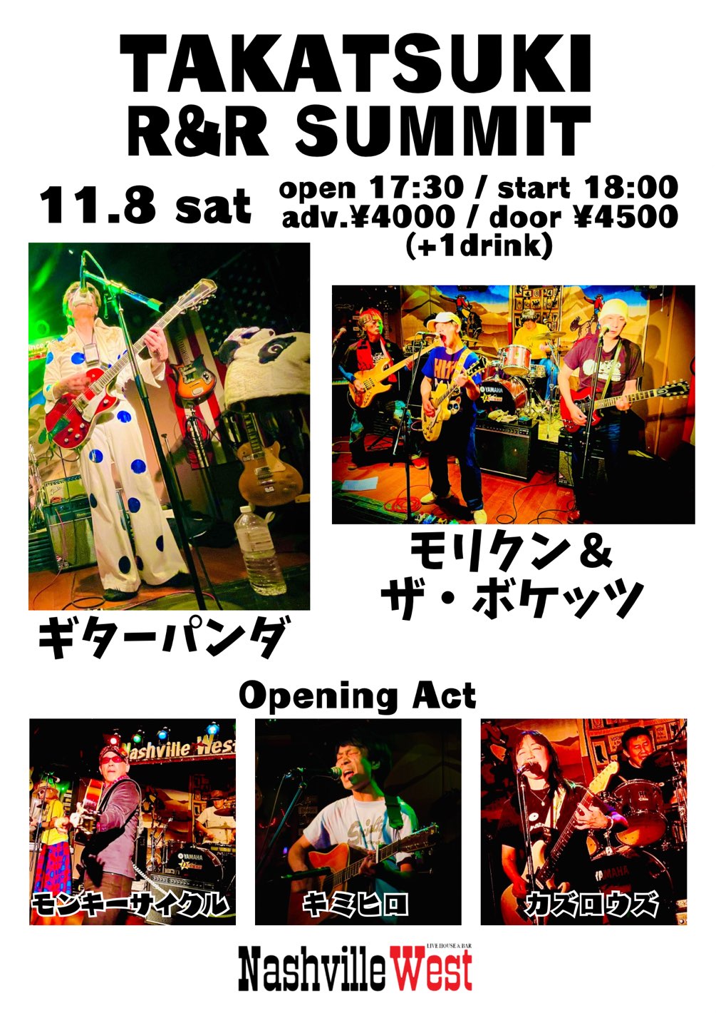 | 2025年11月8日(土) 『TAKATSUKI R&R SUMMIT』〈ギターパンダ/モリクン&ザ・ボケッツ 【Opening Act:モンキーサイクル/カズロウズ/キミヒロ】〉 | ||