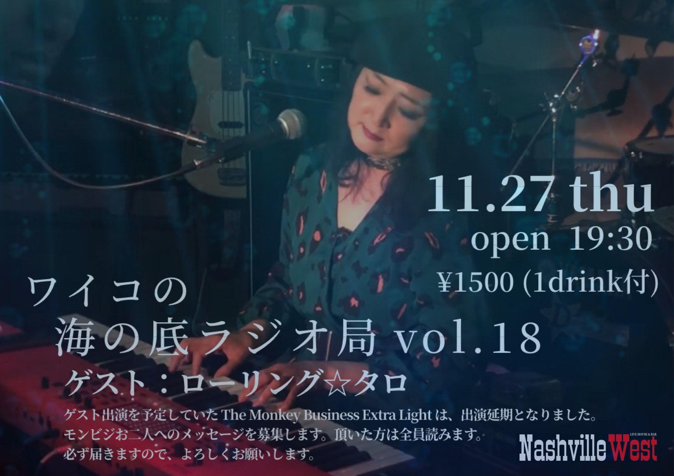 | 2025年11月27日(木) 〈トーク〉『ワイコの “海の底ラジオ局”vol.18 〜ぶっ飛ばせミッドナイト〜』〈メインパーソナリティ:ワイコ/代打ゲスト:ローリング☆タロ〉 | ||