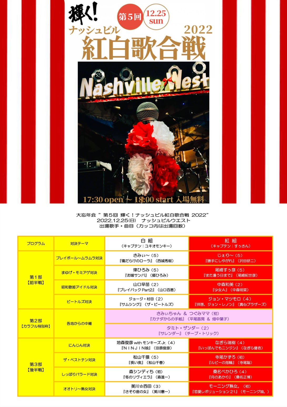 | 2022年12月25日(日) 大忘年会 ”第5回 輝く!ナッシュビル紅白歌合戦 2022” | ||