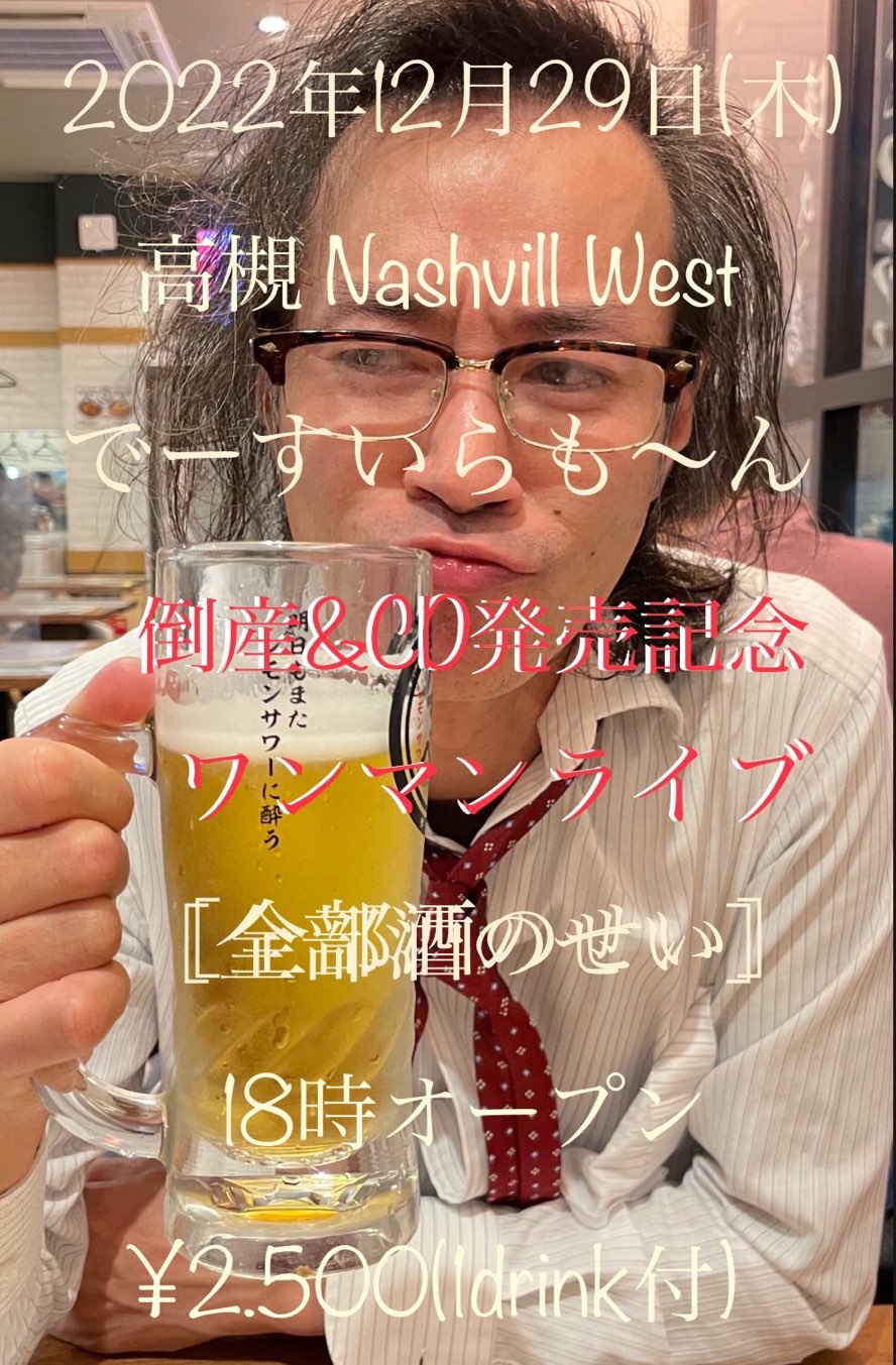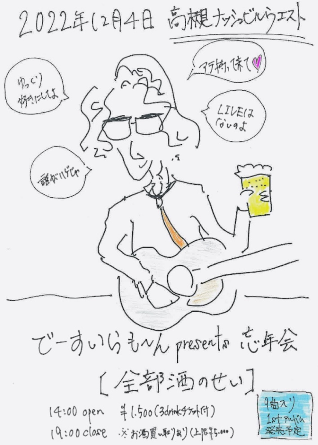 | 2022年12月4日(日) ★ナッシュビルウエスト 15周年★ でーすいらも〜ん presents 忘年会『全部酒のせい』 | ||