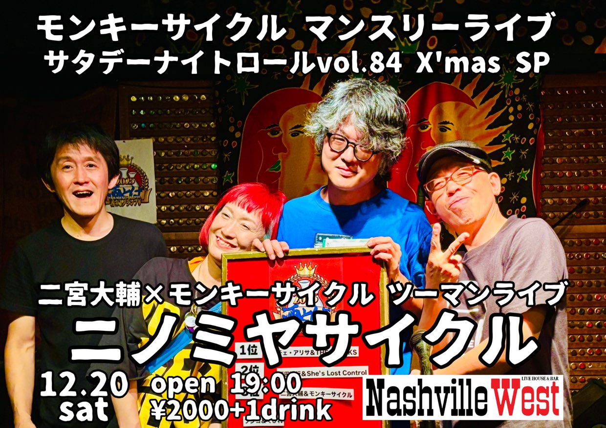 | 2025年12月20日(土) モンキーサイクル マンスリーライブ ”サタデーナイトロール”Vol.84 ★ナッシュビル・クリスマス・スペシャル★ モンキーサイクル × 二宮大輔とけうけげん ツーマンライブ "ニノミヤサイクル" | ||