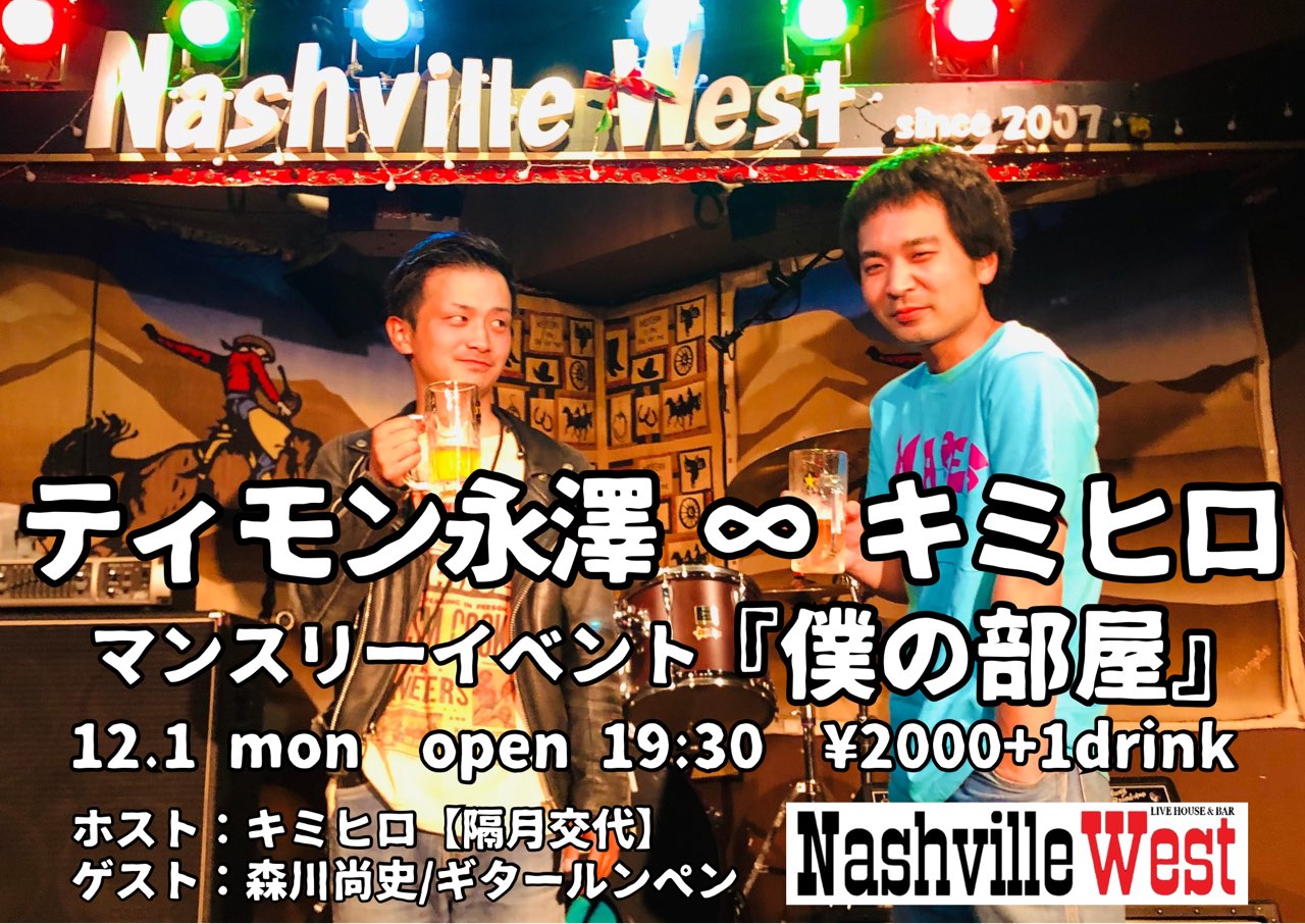 | 2025年12月1日(月) 『僕の部屋 vol.17』〈【ホスト】キミヒロ【ゲスト】森川尚史/ギタールンペン〉(毎月第1月曜日) | ||