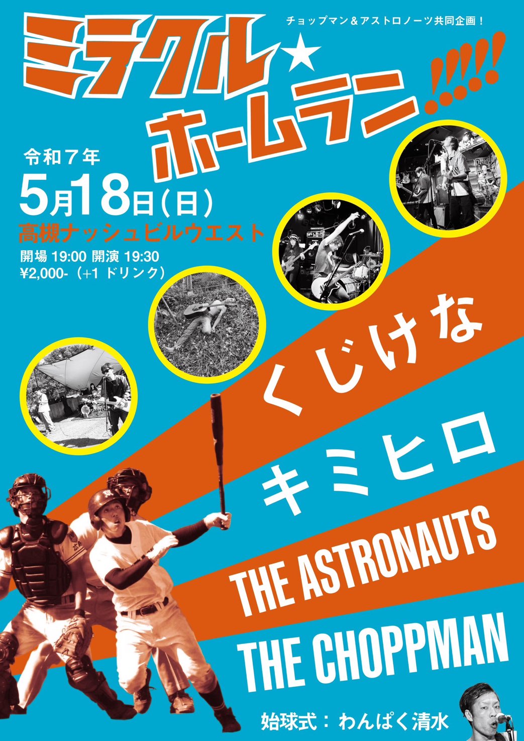 | 2025年5月18日(日) チョップマン&アストロノーツ共同企画『ミラクル☆ホームラン』〈くじけな/キミヒロ/THE ASTRONAUTS/THE CHOPPMAN/始球式:わんぱく清水〉 | ||