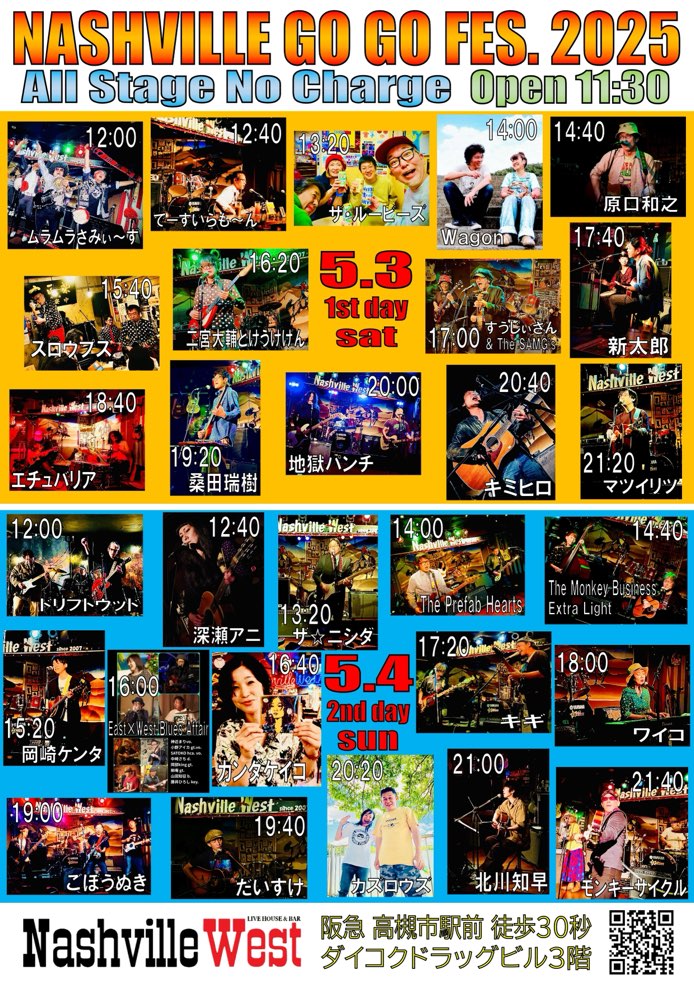 | 2025年5月4日(日) NASHVILLE GO GO FES. 2025 [2nd DAY]〈ドリフトウッド/深瀬アニ/ザ☆ニシダ/The Prefab Hearts/The Monkey Business Extra Light/岡崎ケンタ/岡部キング バンド/カンダケイコ/キギ/ワイコ/ごぼうぬき/だいすけ/カズロウズ/北川知早/モンキーサイクル〉 | ||