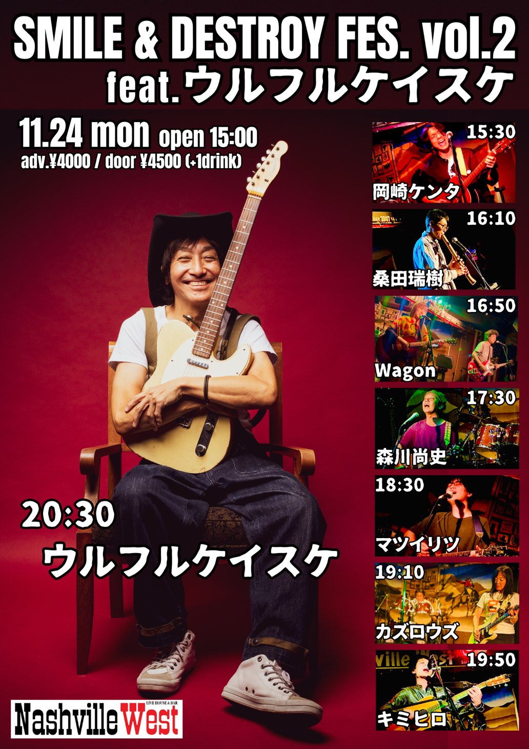 | 2025年11月24日(月) SMILE & DESTROY FES. vol.2 feat.ウルフルケイスケ【ウルフルケイスケ/岡崎ケンタ/桑田瑞樹/Wagon/森川尚史/マツイリツ/カズロウズ/キミヒロ】 | ||