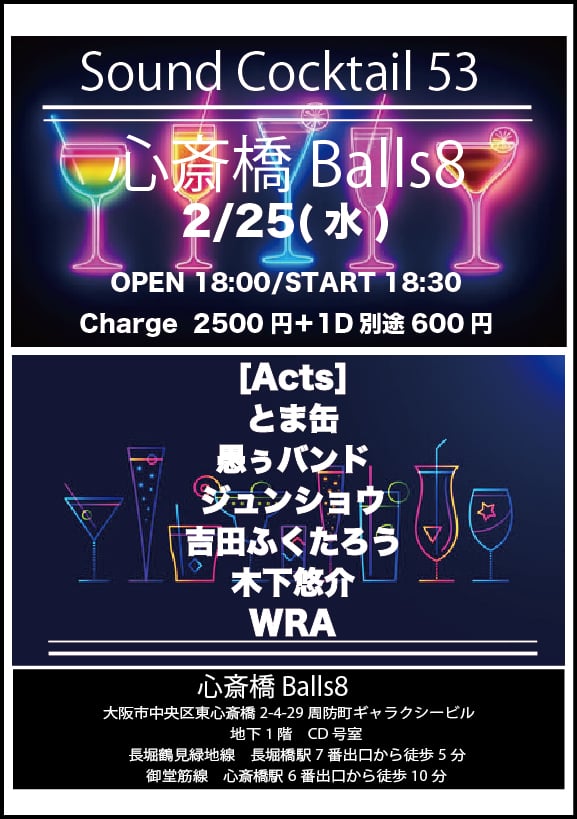 18:00 open 〜 18:30 start 予約 \4,500 / 当日 \5,000(ともに+1drink)