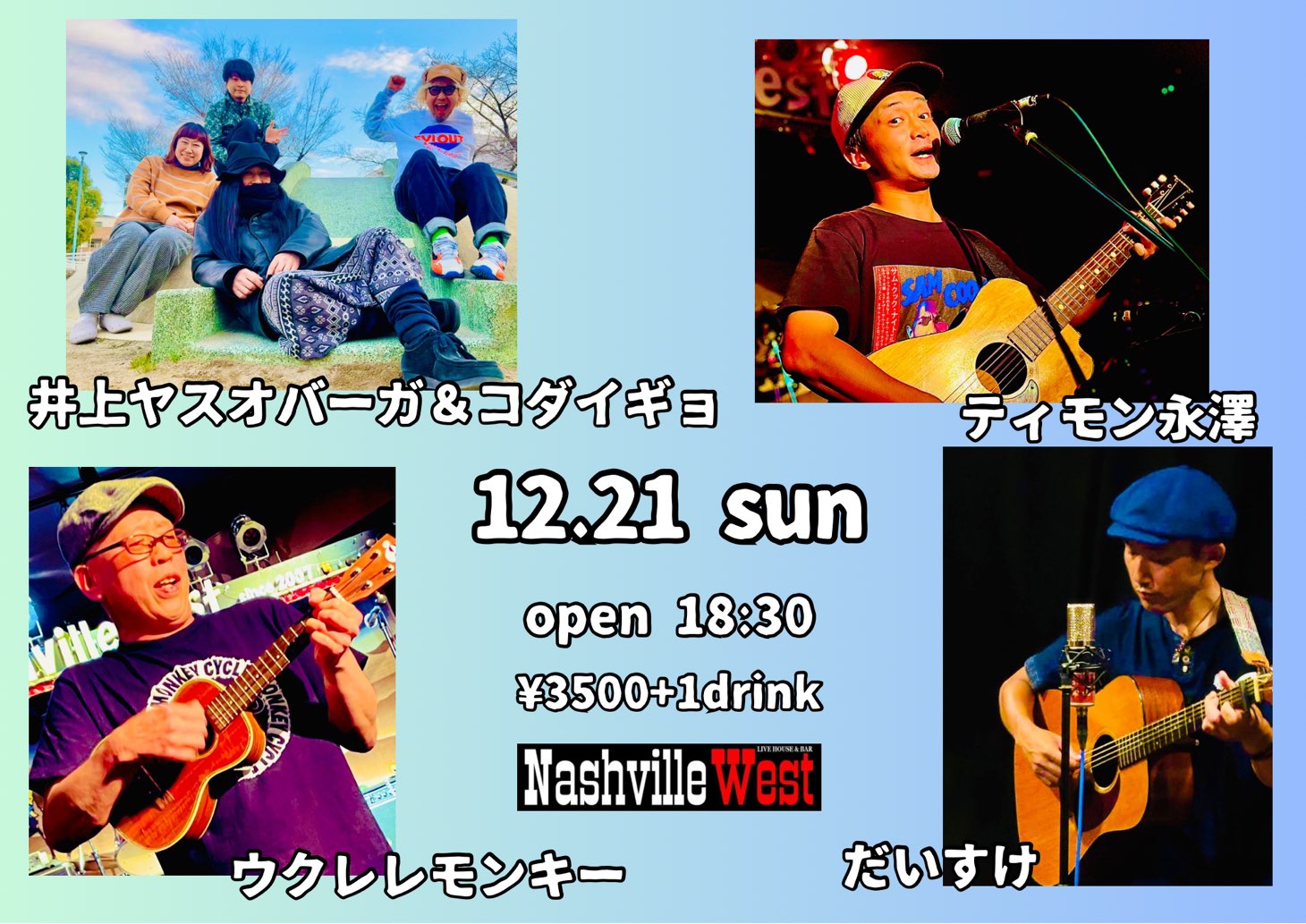 | 2025年12月21日(日) 井上ヤスオバーガー&コダイギョ/だいすけ/ティモン永澤/ウクレレモンキー | ||